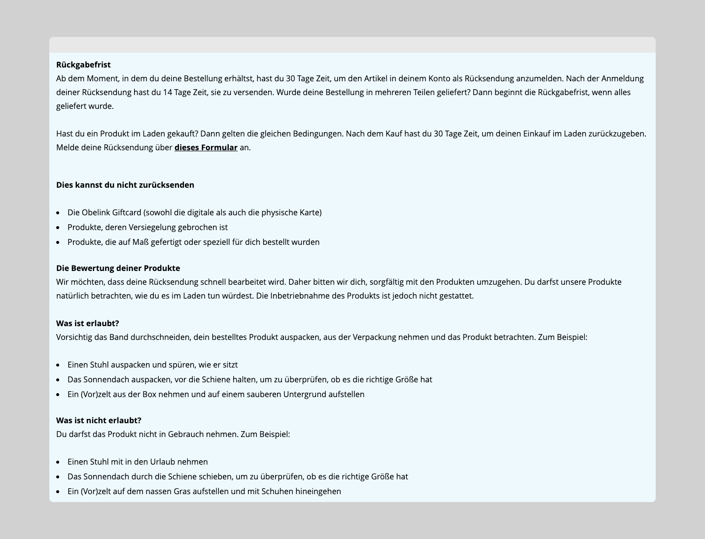 Wir sind jetzt gespannt, wie Obelink mit der Retoure (wir haben auch Zubehör wie den Teppich zurückgeschickt) umgeht und ob man am Ende versucht, uns Abzüge zu berechnen, weil es ja gebraucht wurde, denn mit Abzügen warnt Obelink tatsächlich in den Rückgabebedingungen: